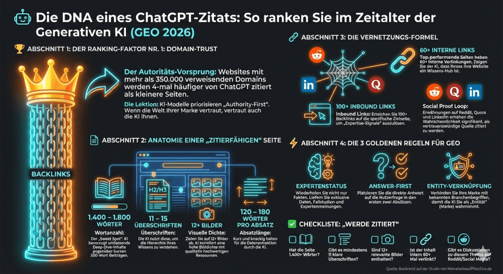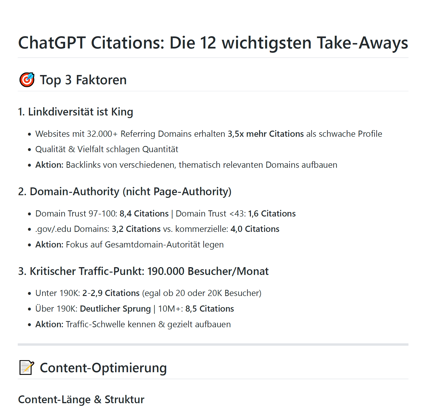 Content mit 19 oder mehr statistischen Datenpunkten erhalten 5,4 Citations im Vergleich zu 2,8 für Seiten mit minimalen Daten – das unterstreicht klar, dass ChatGPT datengestützte, gut recherchierte Inhalte bevorzugt und honoriert.